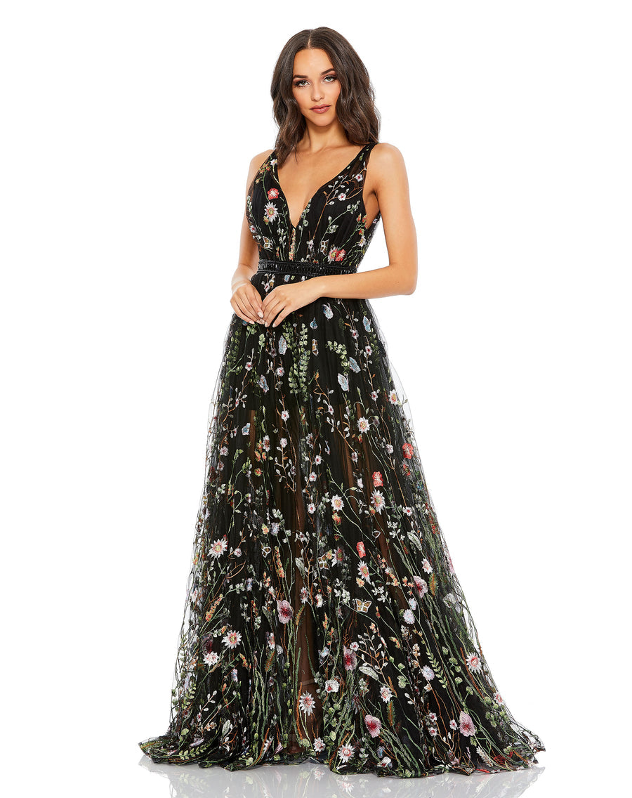 Floral embroidered mesh gown with a plunging neckline and v-cut back. The sheer a-line tulle skirt features a built-in romper that hits mid-thigh.