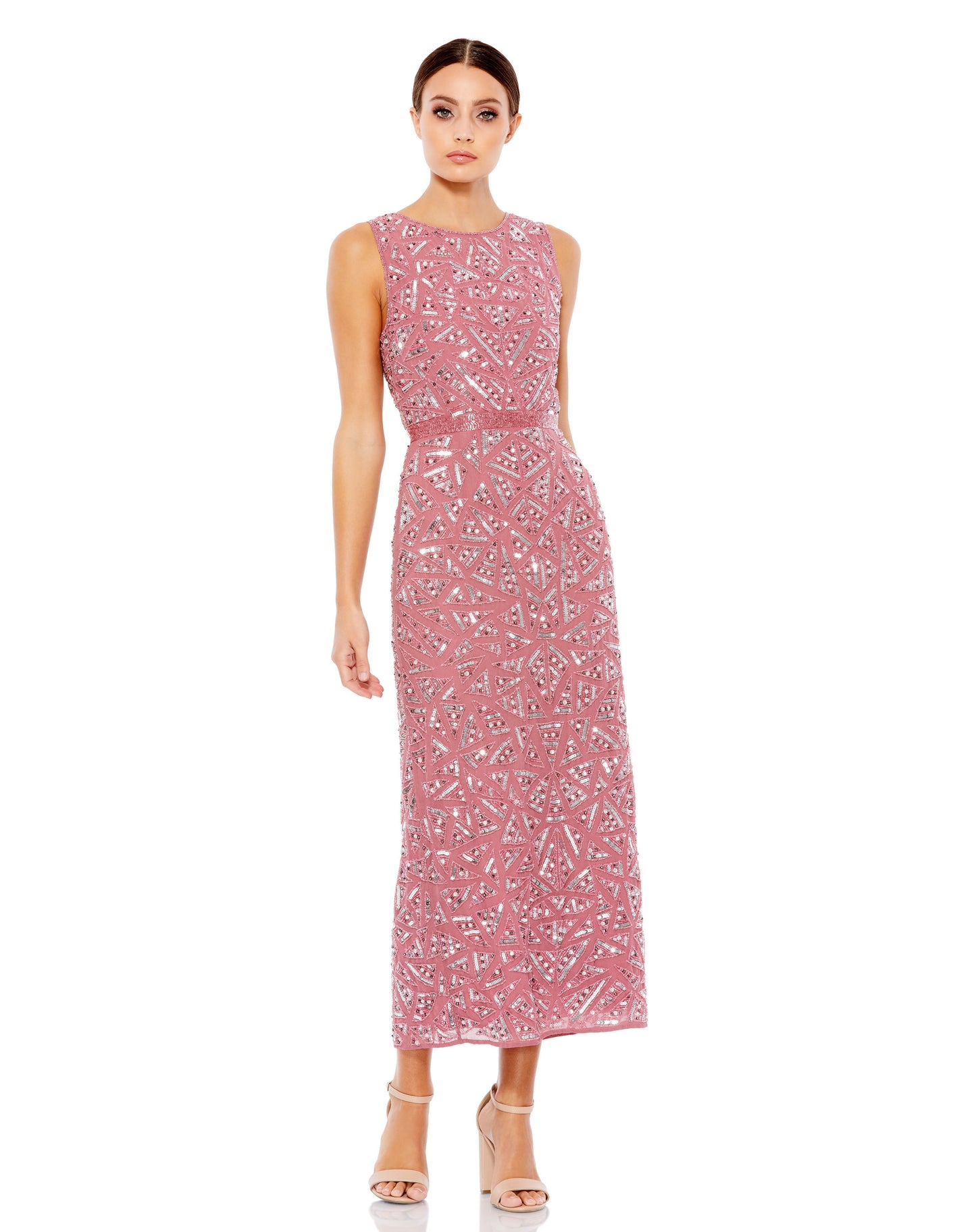 Chic midi dress with geometric-patterned embellishment throughout, a hand-beaded belt, and a center back vent.