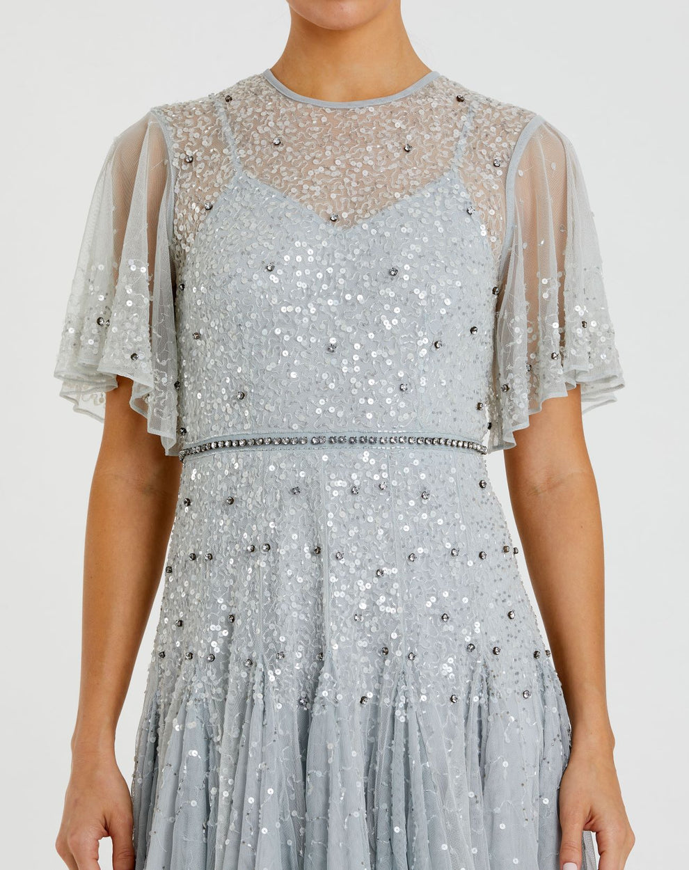 Exquisite hand-embellished mesh overlay dress, featuring a partially lined bodice and a fully lined skirt for a sleek fit. The sheer unlined sleeves add a delicate touch, while the high neckline with an illusion high neck overlay creates a sophisticated, dramatic look. Short flounce sleeves and a rhinestone-encrusted waist detail complete the design, making this dress perfect for formal events, galas, or evening soirées.