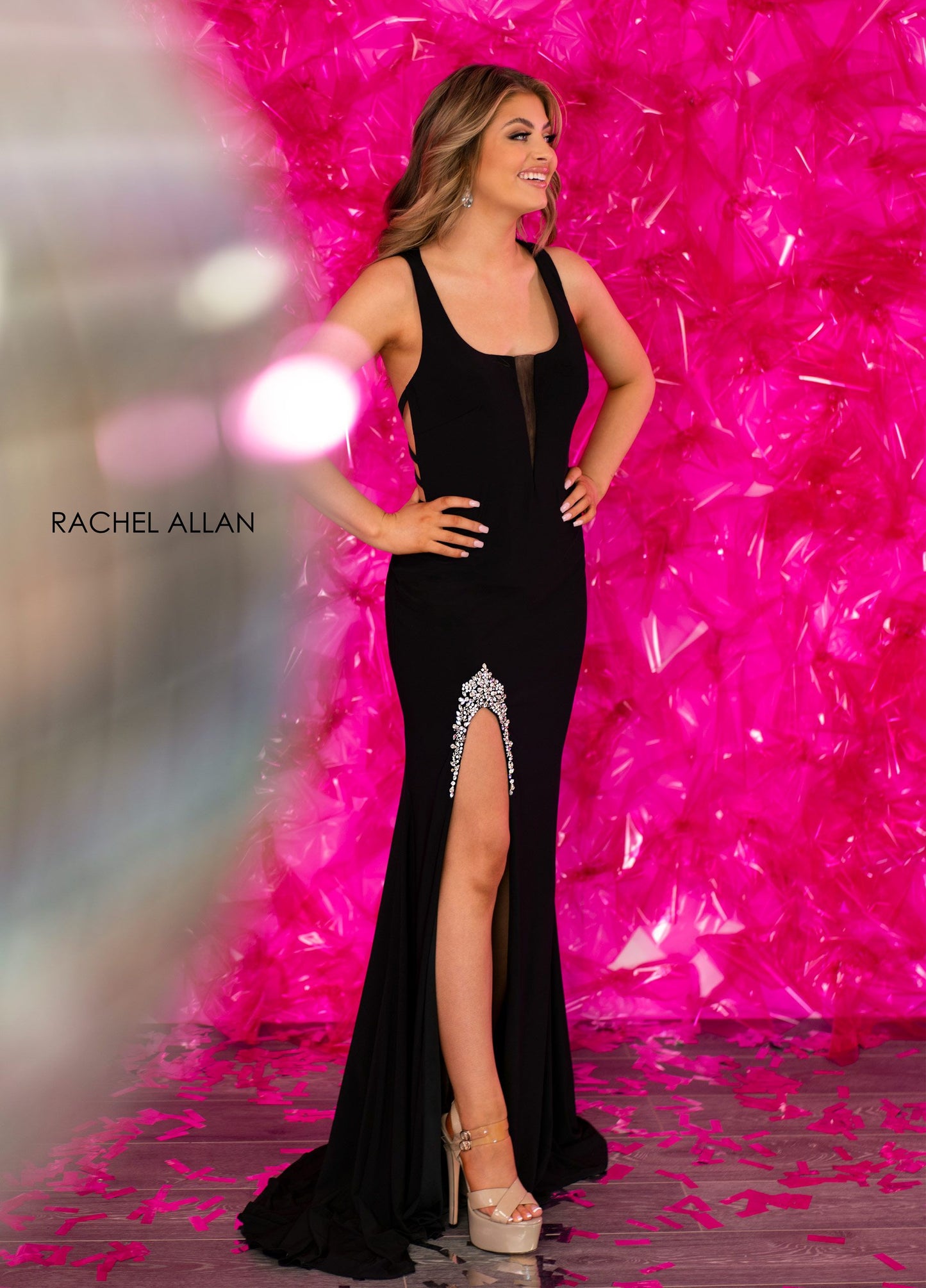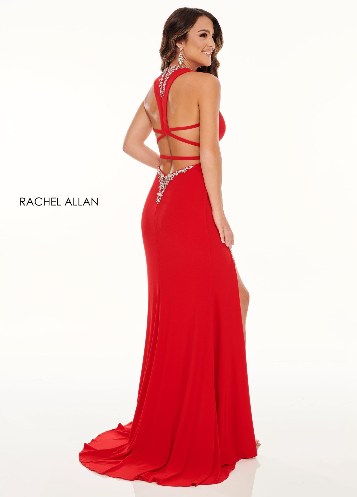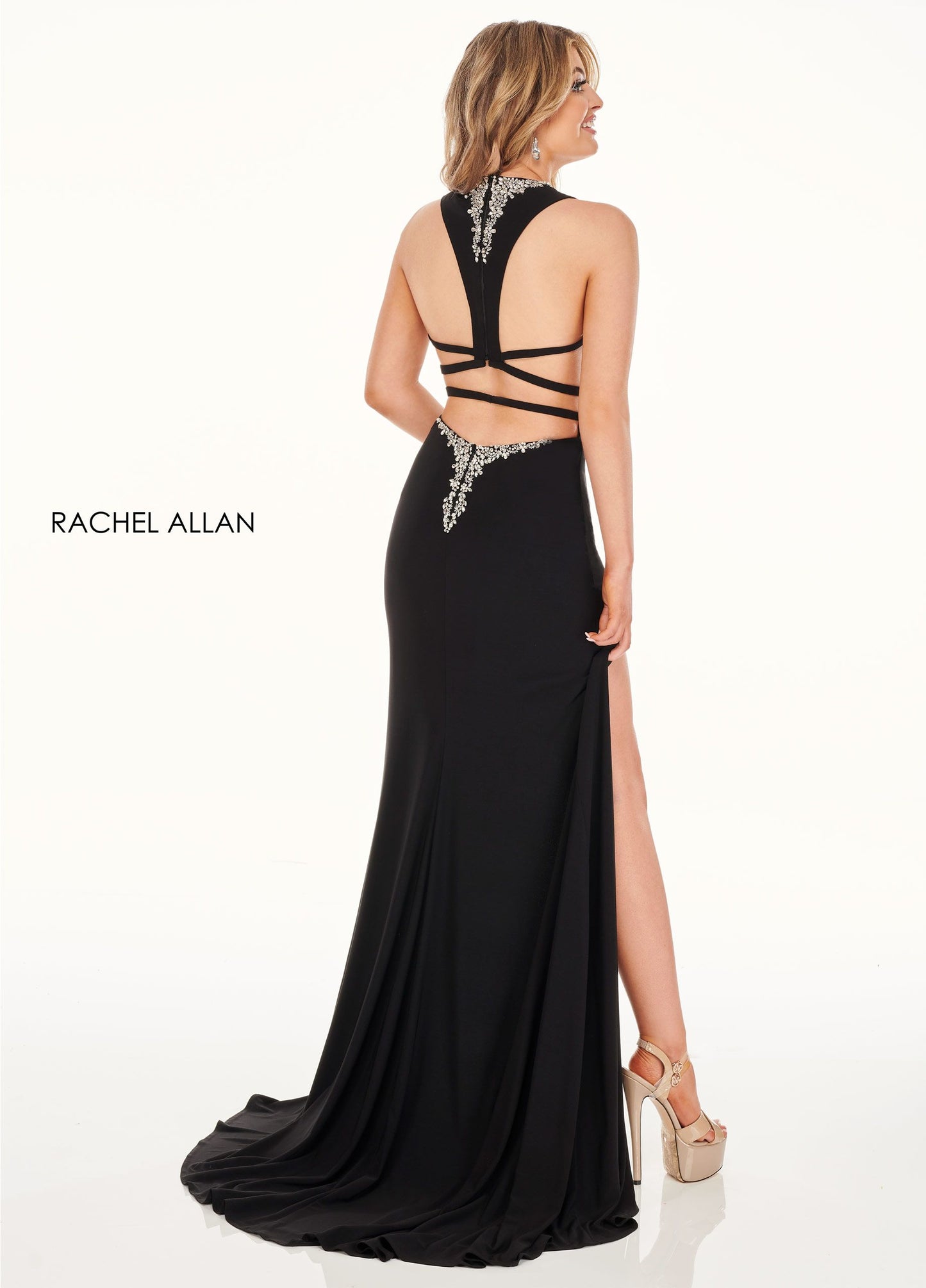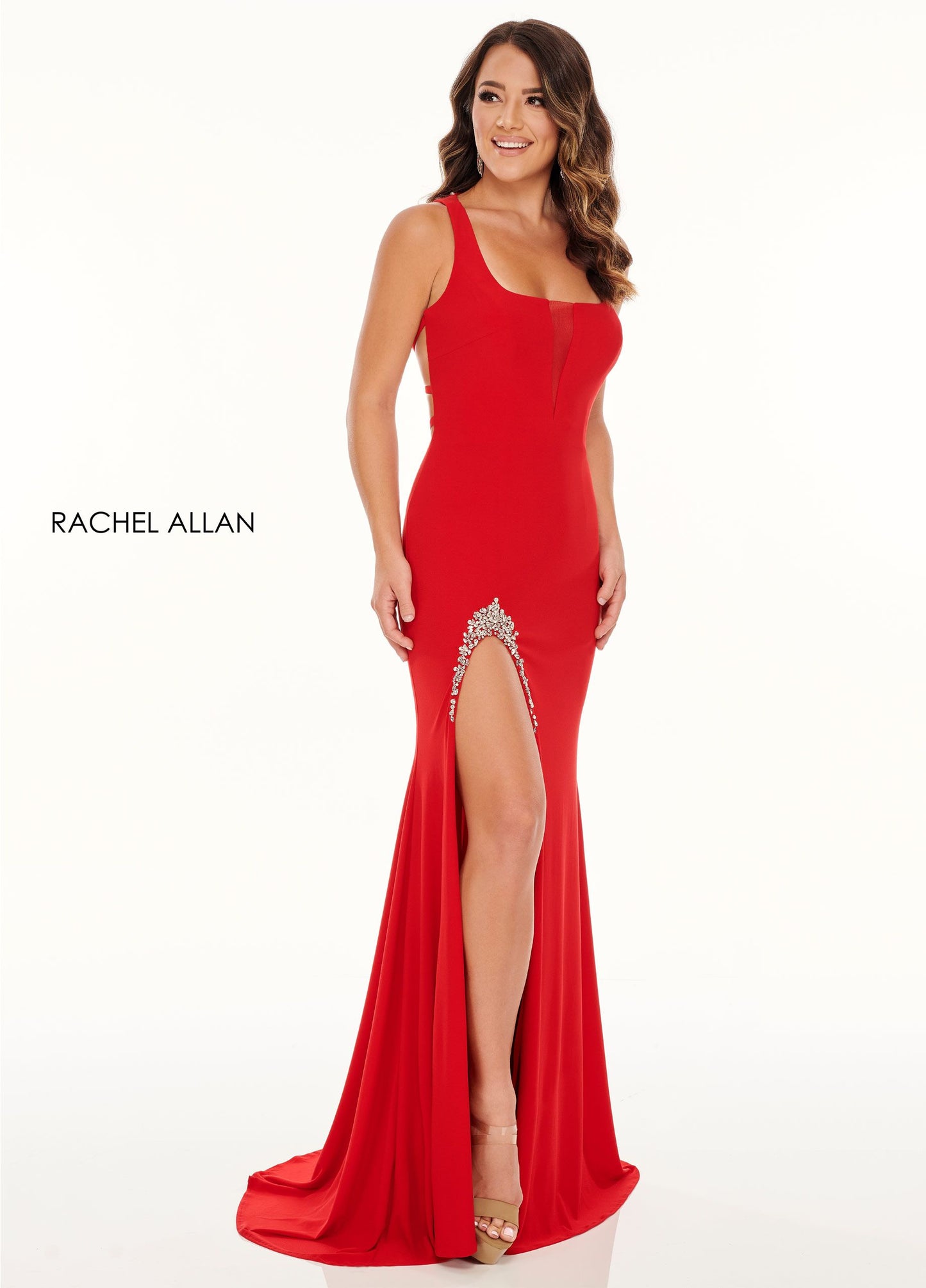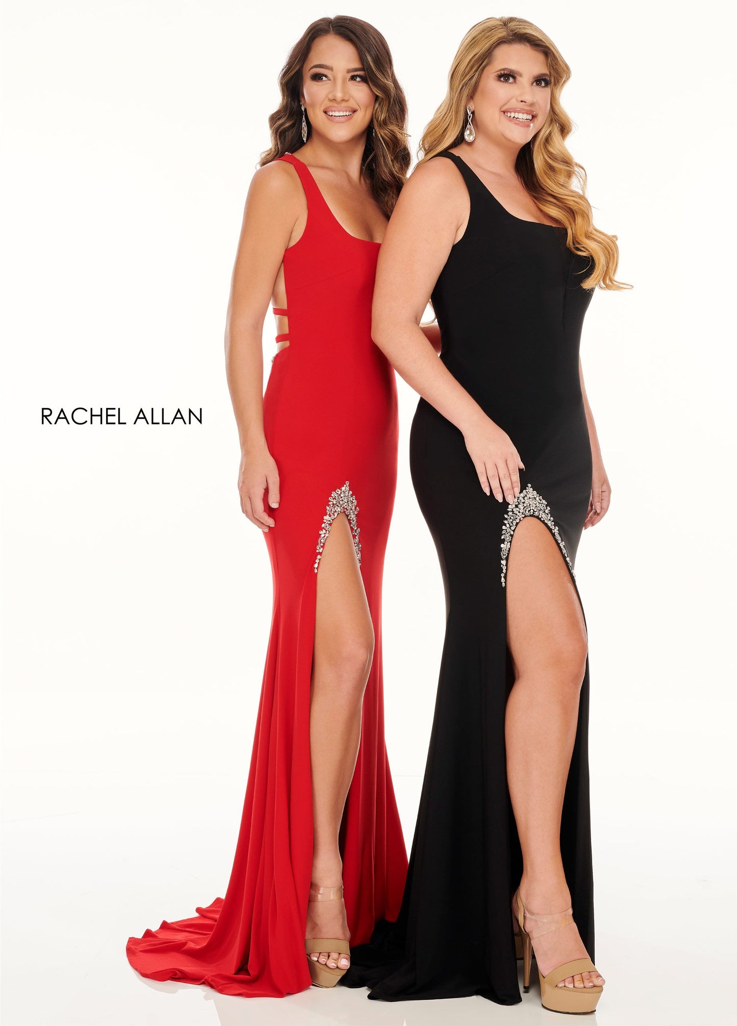 Date night or Prom, either way this gown was made for YOU! We love the simplicity in this jersey scoop neck dress designed with a racer-back effect and silver rhinestones outlining the high slit.