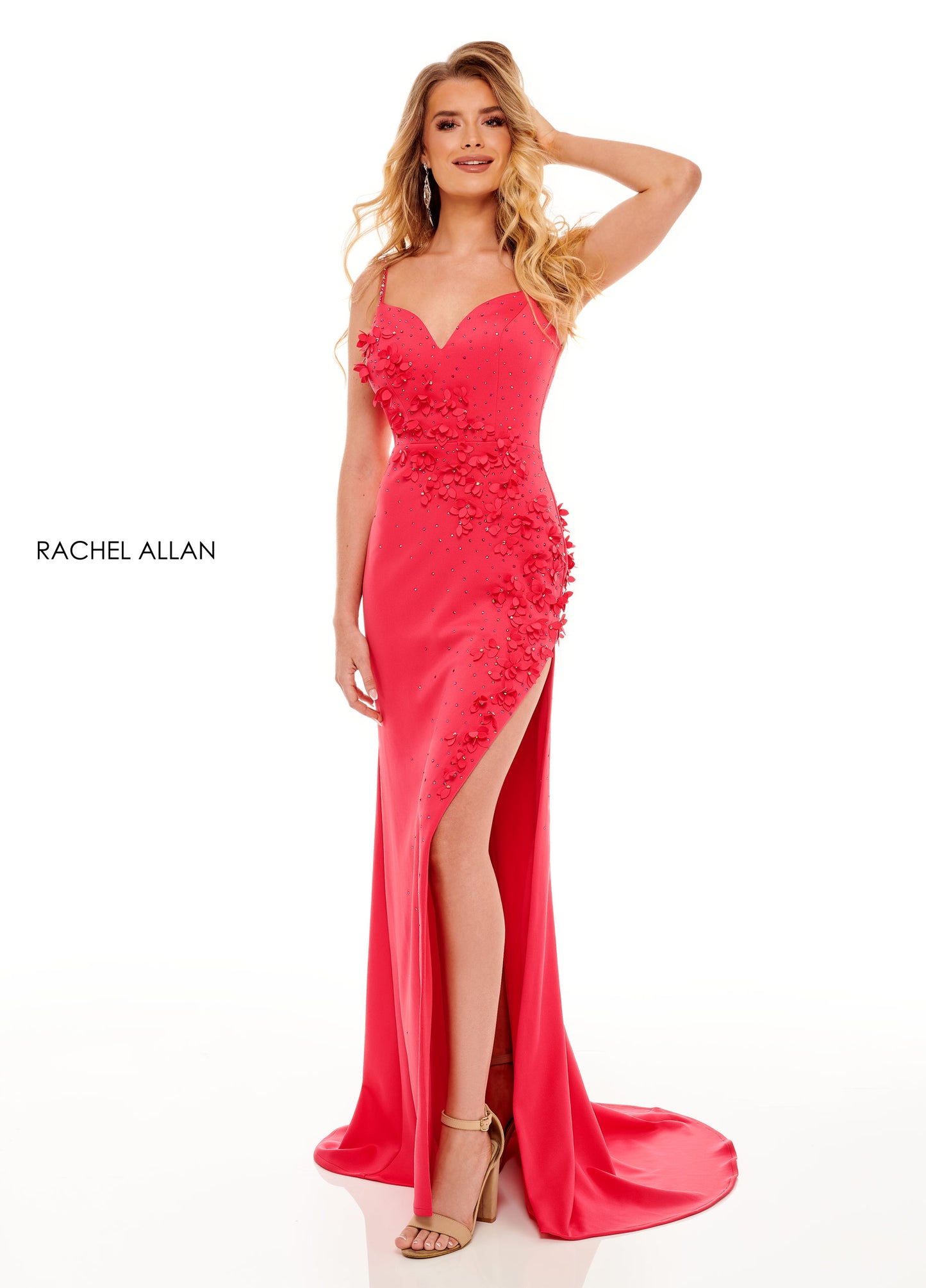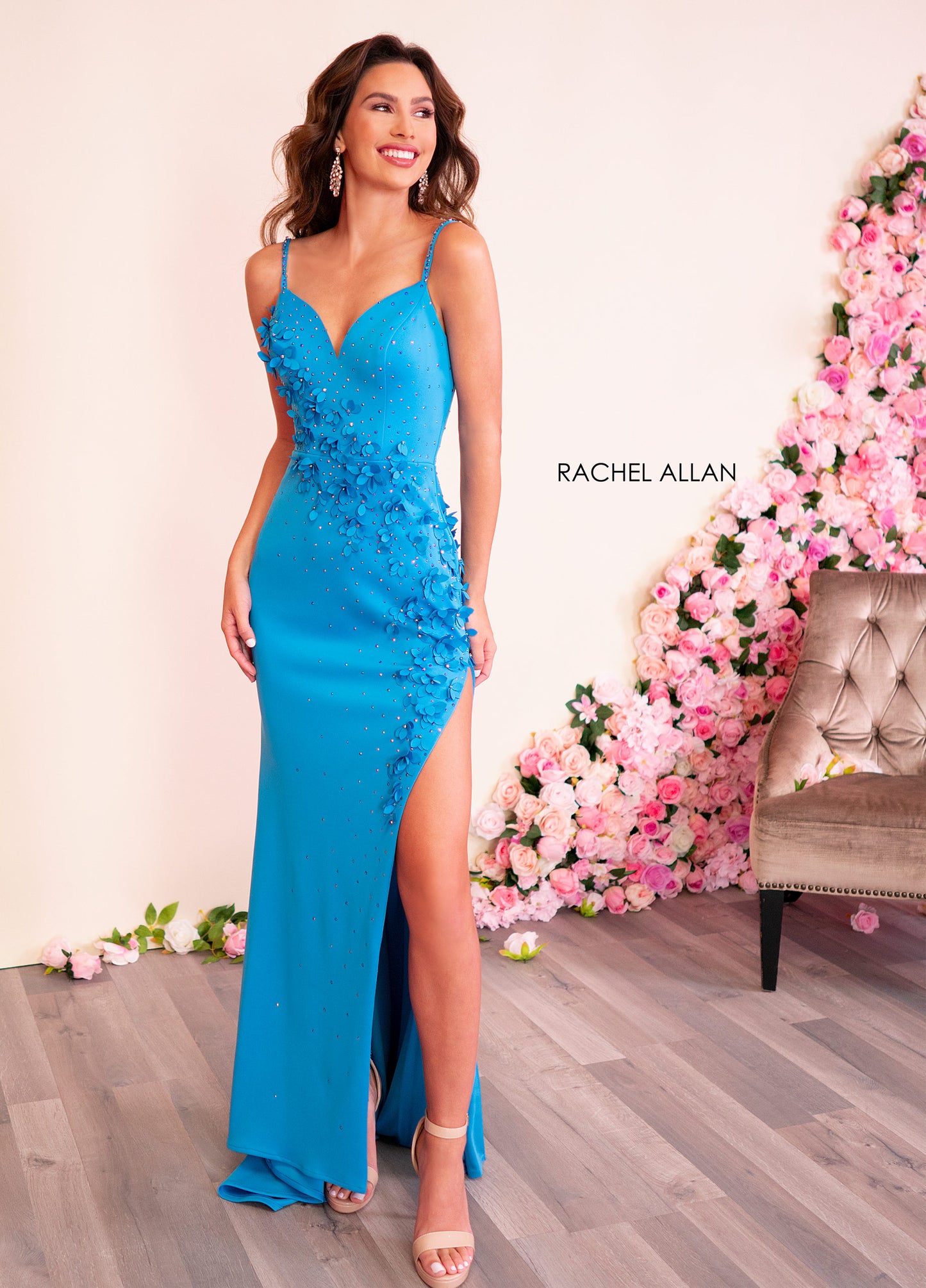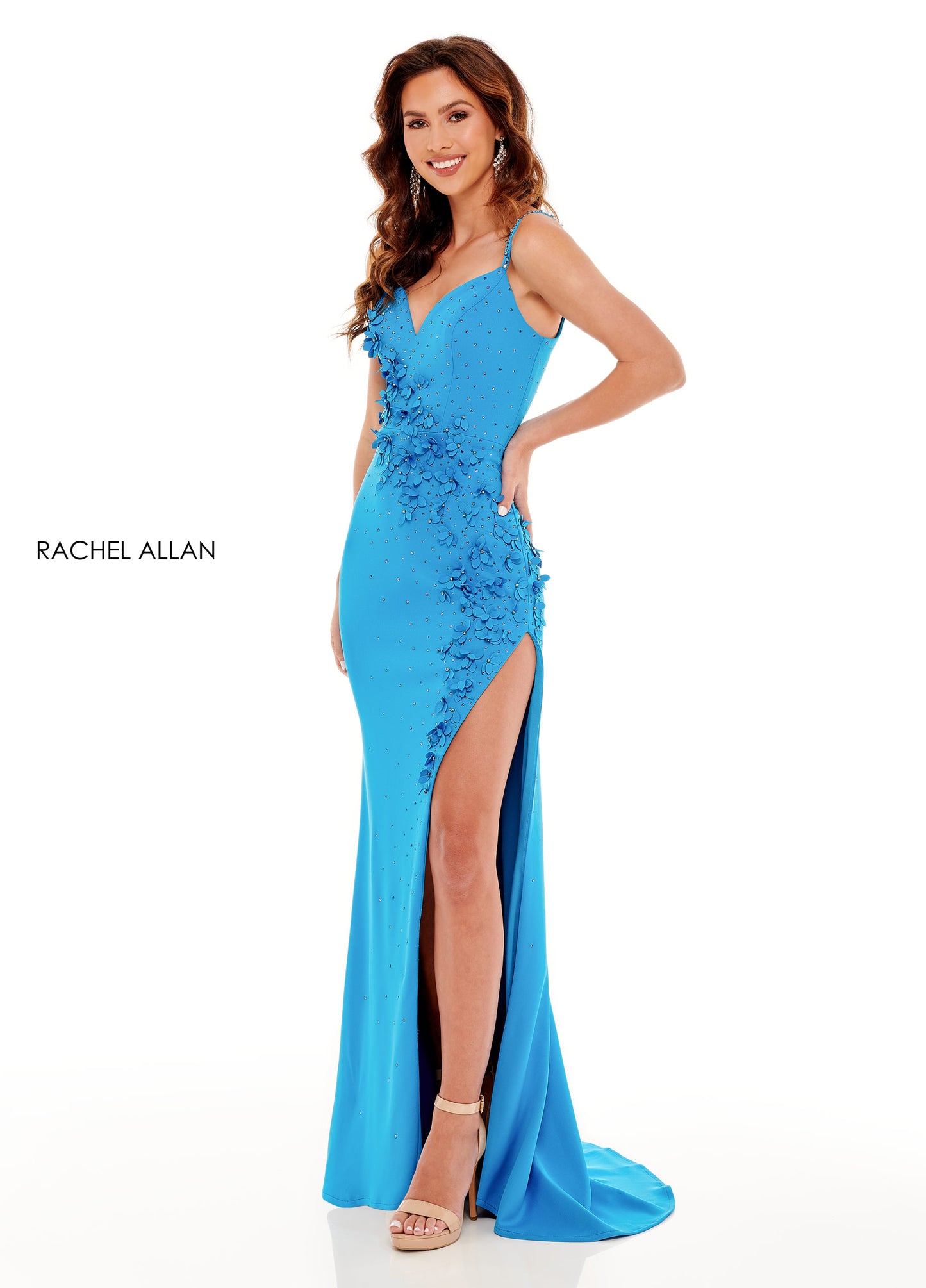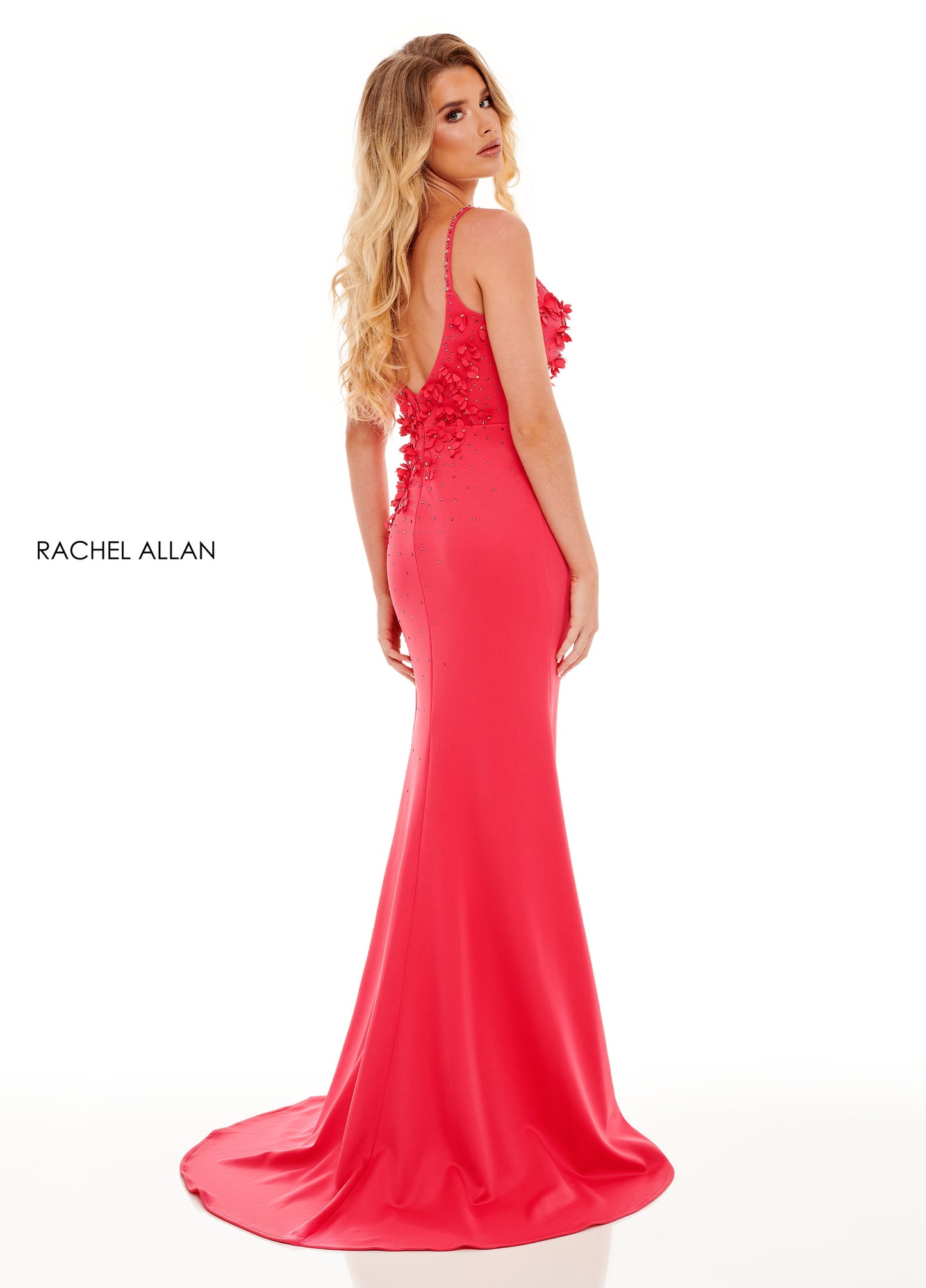 There are the 3D flower everyone is talking about. Wear this scuba fitted gown made with a cascading array of 3D flowers flowing from the bodice down the skirt.