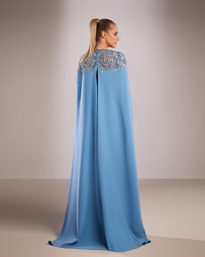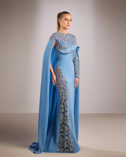 Expertly crafted, the Reverie Couture FW199 Dress exudes elegance and sophistication. Made from a fitted blue crepe material, this gown features a stunning gold and silver beaded bodice, with fully embellished sleeves and open beaded sides. Its unique design also includes a long cape, adding a touch of glamour to any occasion.