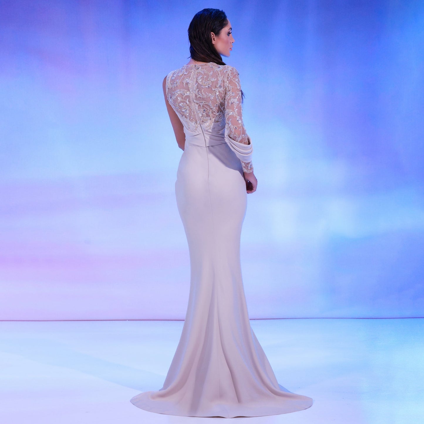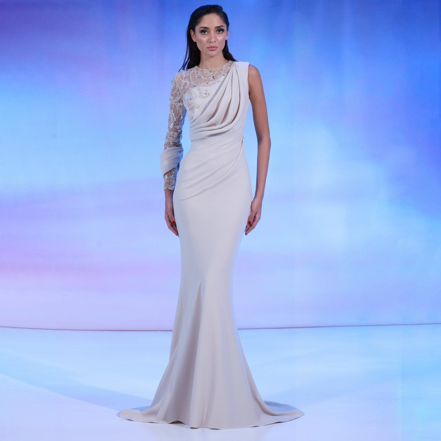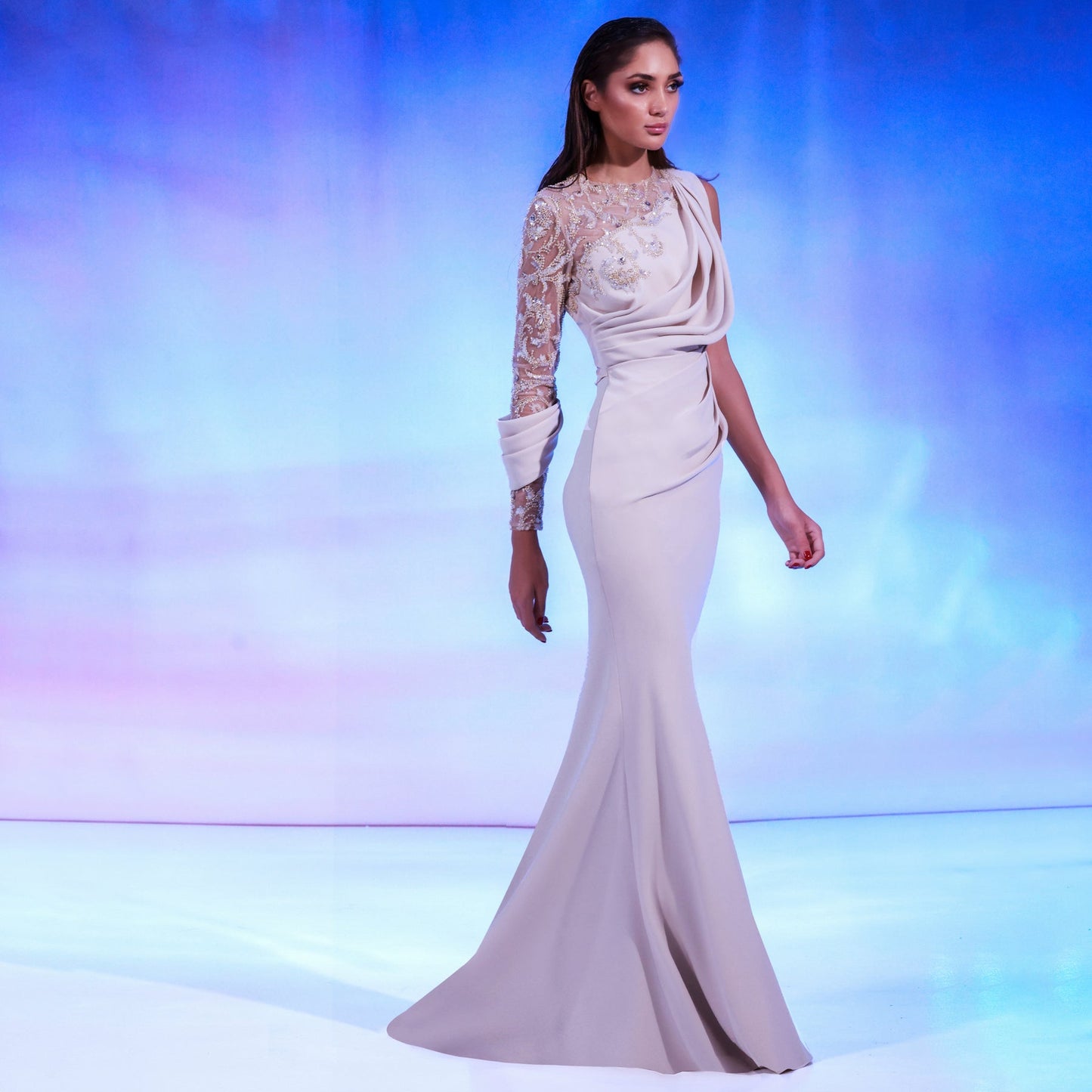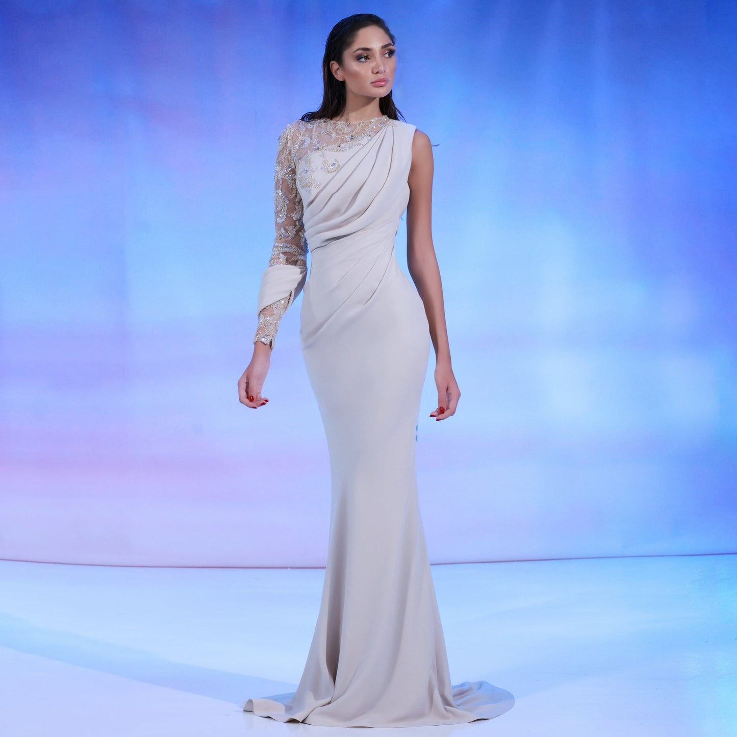 Nude crepe dress features a mermaid-cut skirt, one-sleeve beaded top, complemented by elegant drapes that flow from one shoulder to the waist