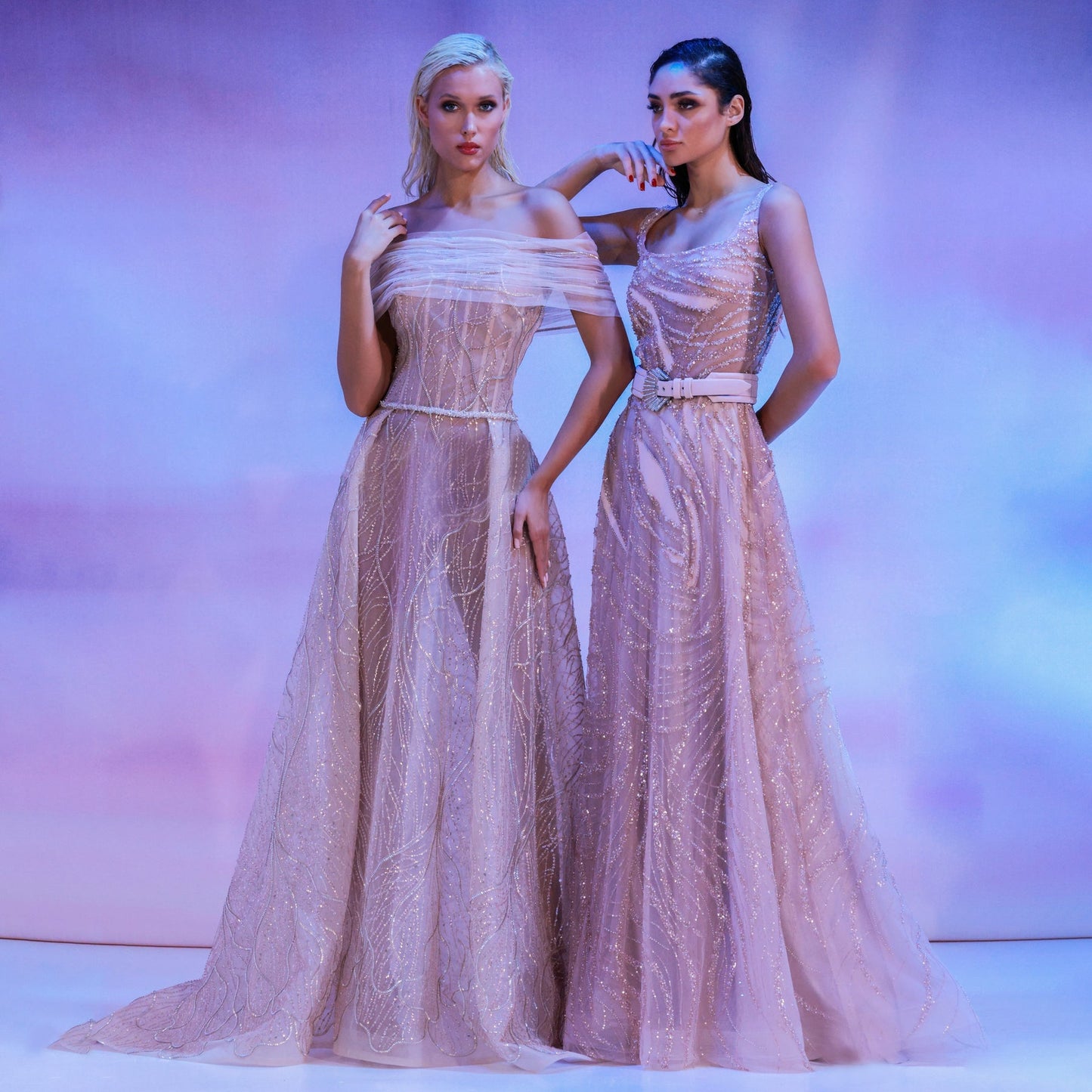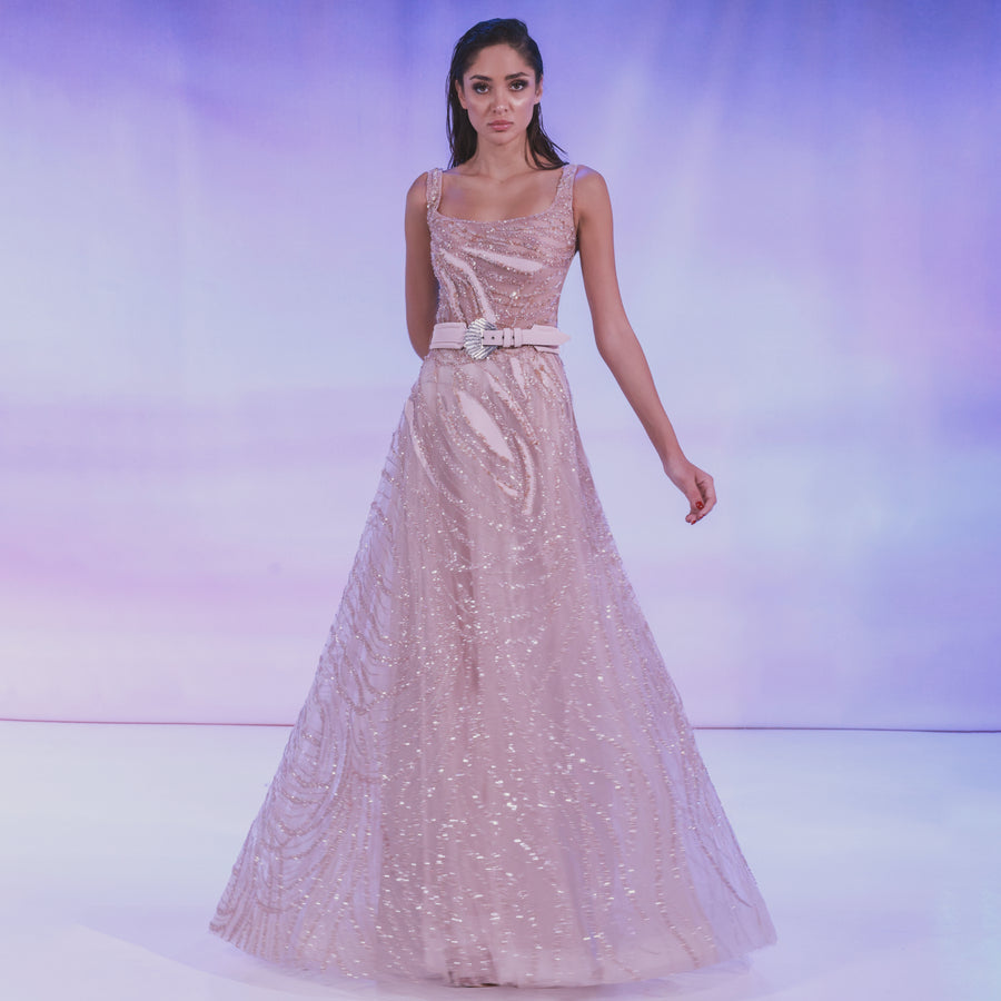 Fully beaded pink A-line dress features a square neckline and is cinched at the waist with a seashell belt.