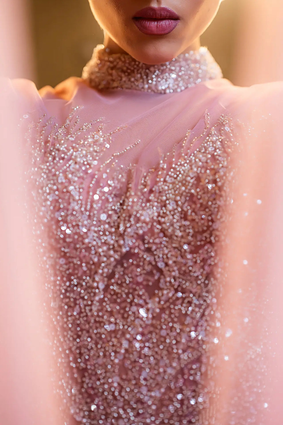 Our fully beaded dress adorned with luxurious cape sleeves is perfect for those special occasions where you want to make a statement.